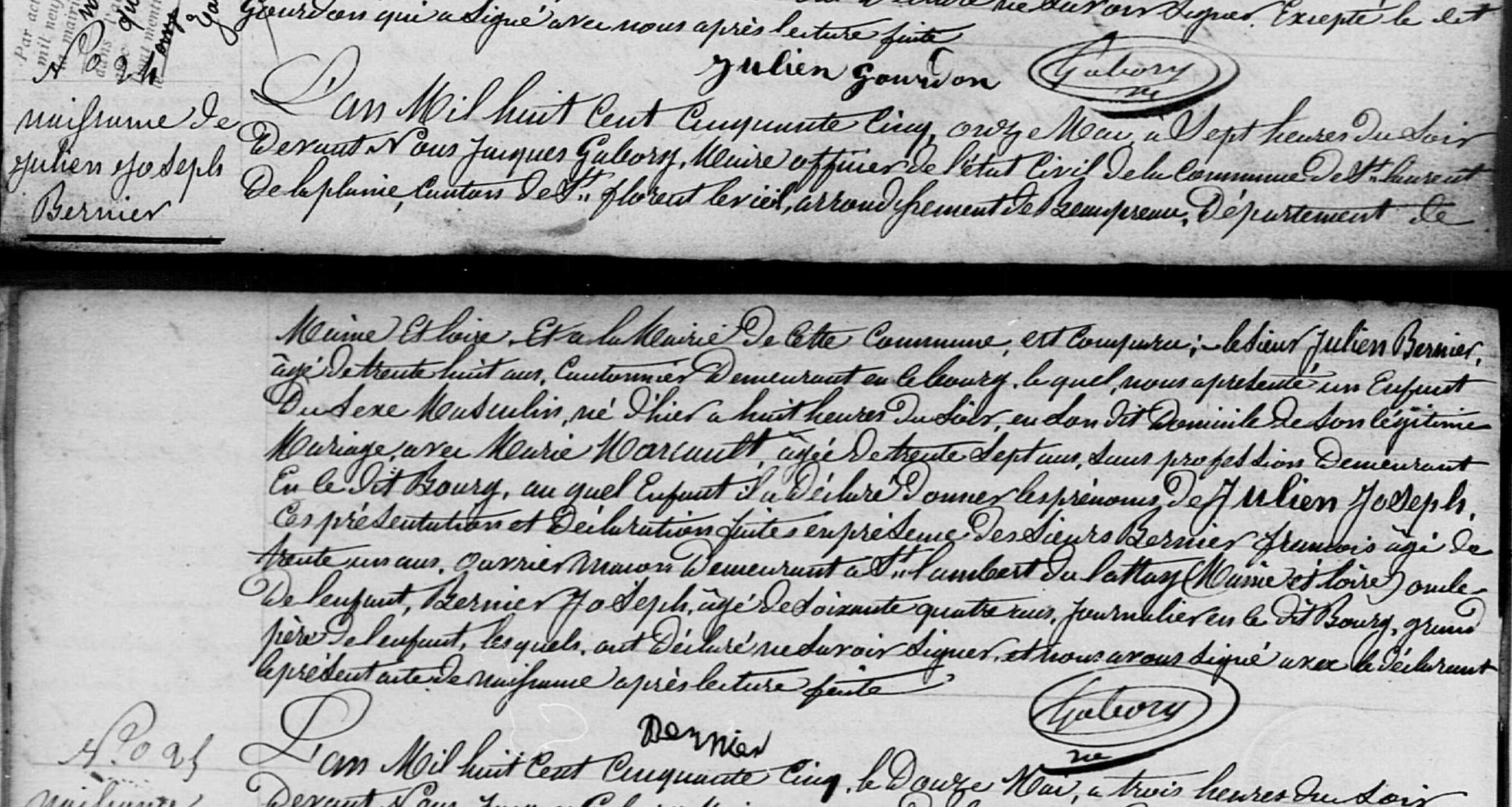 L'an mil huit cent cinquante cinq, onze mai à sept heures du soir Devant Nous Jacques Gabory, Maire officier de l'état civil de la commune de St Laurent De la plaine, canton de St Florent le vieil, arrondissement de Beaupreau, Département de Maine et Loire Et à la Mairie de Cette commune est comparu : le sieur Julien Bernier âgé de trente huit ans, cantonnier demeurant en ce bourg, lequel nous a présenté un enfant du sexe masculin, né d'hier à huit heures du soir en son dit domicile de son légitime mariage avec Marie Marcault âgée de trente sept ans, sans profession demeurant en ce dit bourg, au quel enfant il a déclaré donner les prénoms de Julien Joseph. Ces présentations et Déclarations faites en présence des sieurs Bernier François âgé de trente un ans, ouvrier maçon demeurant St Lambert du Lattay (Maine et Loire) oncle de l'enfant, Bernier Joseph, âgé de soixante quatre ans, journalier en ce dit Bourg, grand père de l'enfant lesquels ont déclaré ne savoir signer, et nous avons signé avec le déclarant le présent acte de naissance après lecture faite.